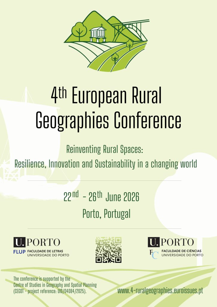 The Faculty of Arts and Humanities and the Faculty of Sciences of the University of Porto are delighted to host the 4th European Rural Geographies Conference, which will take place from 22 to 26 June 2026. The conference theme, Resilience, Innovation and Sustainability in a Changing World, reflects the pressing challenges and opportunities that rural areas across Europe and beyond are currently facing.